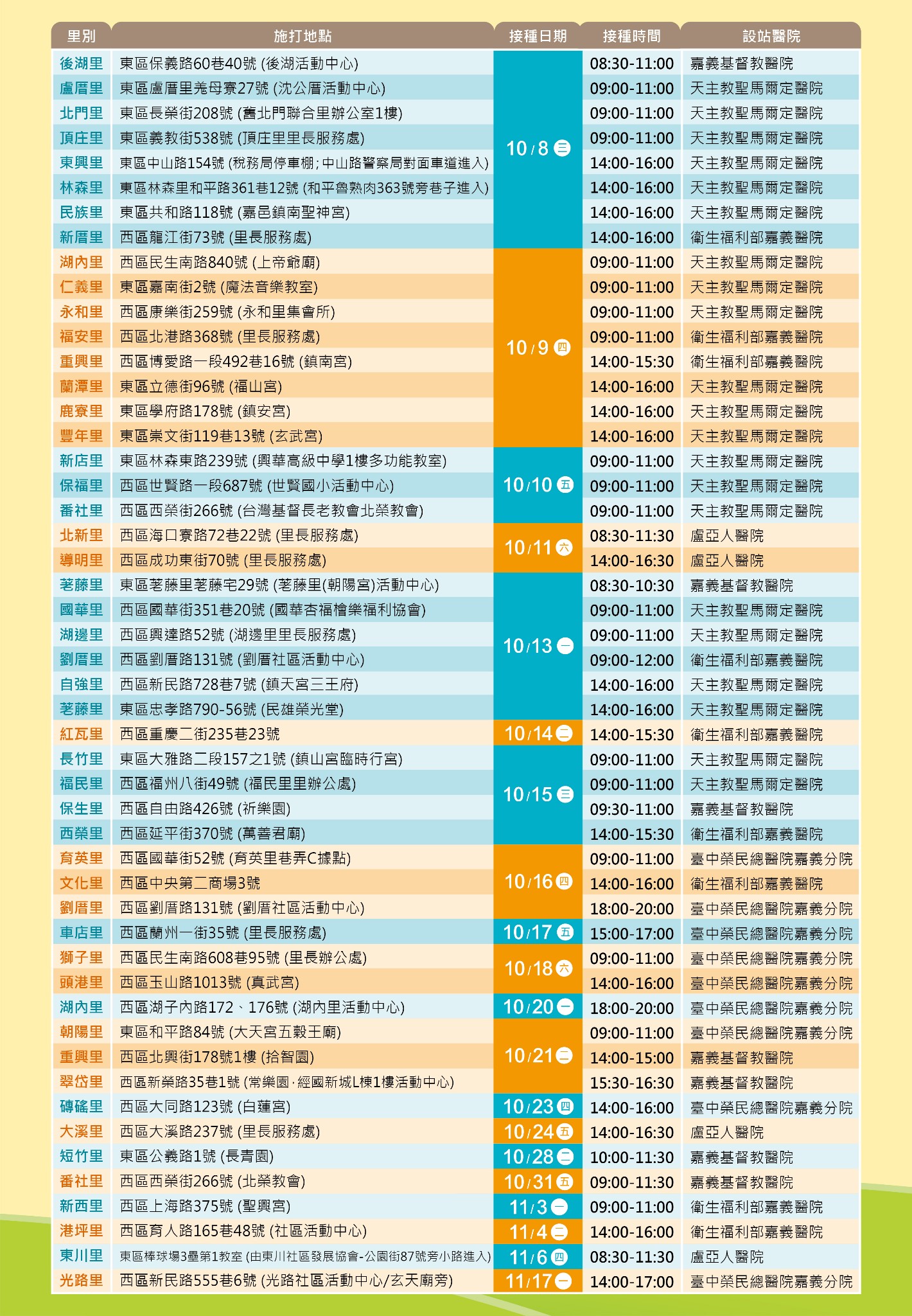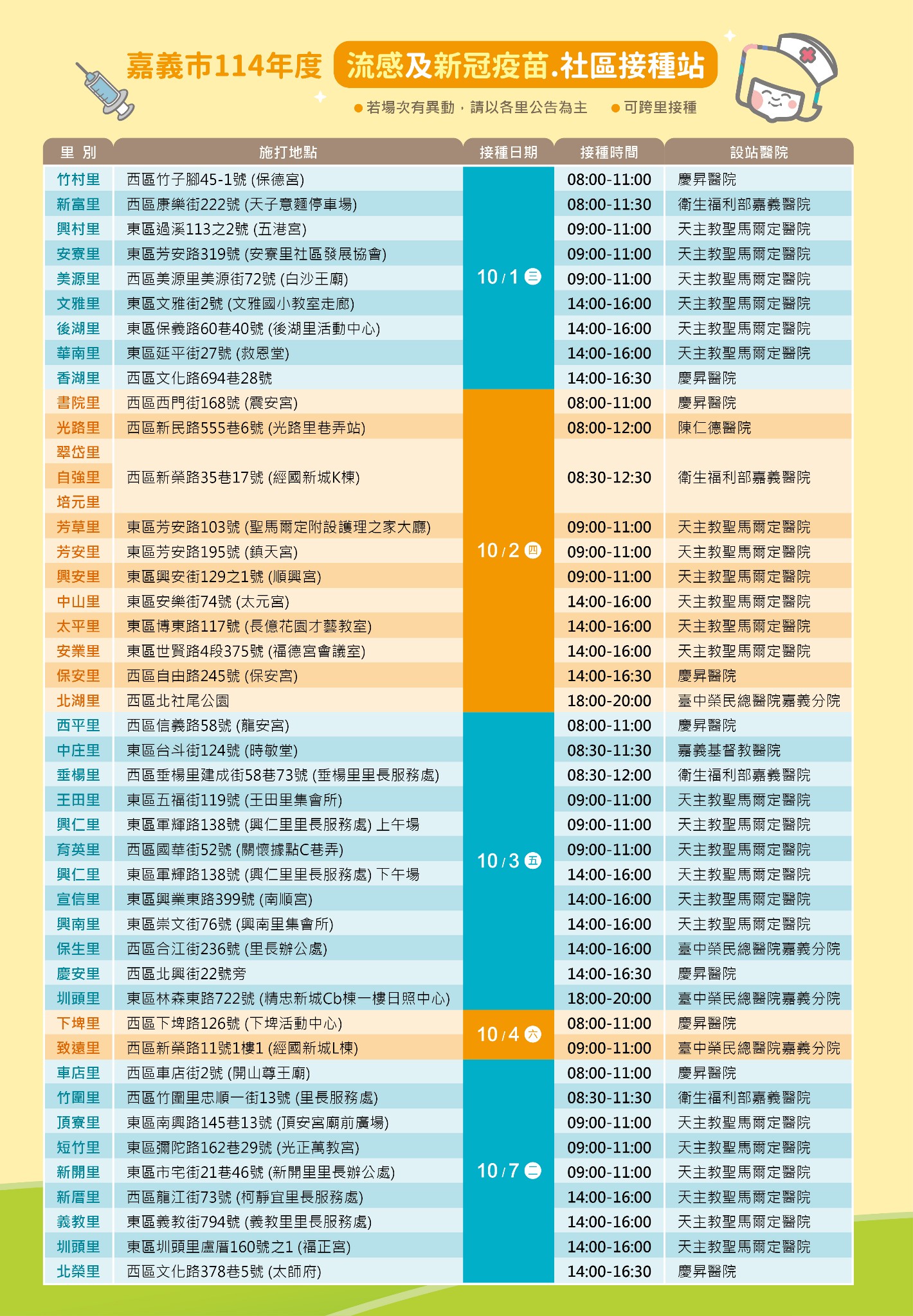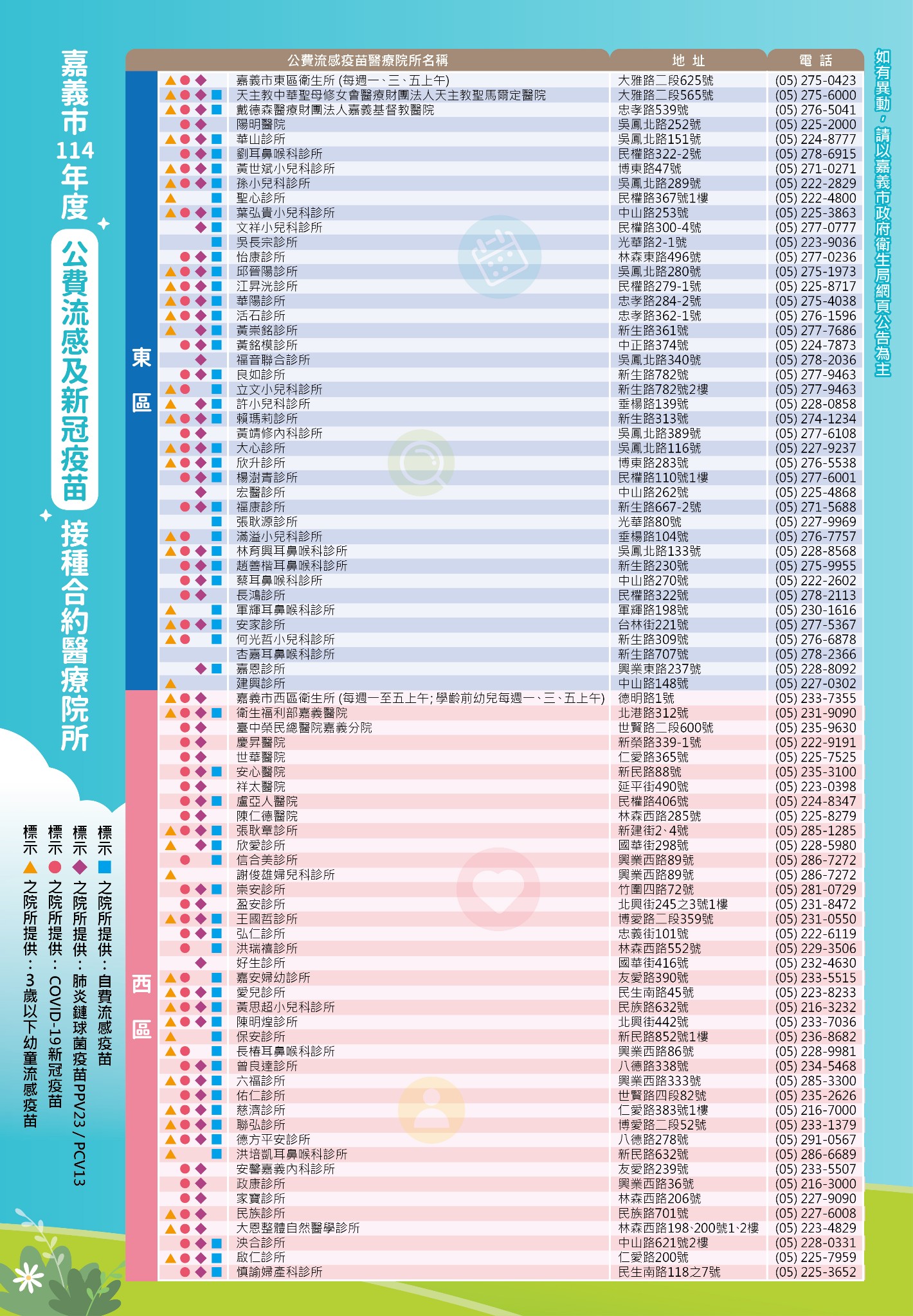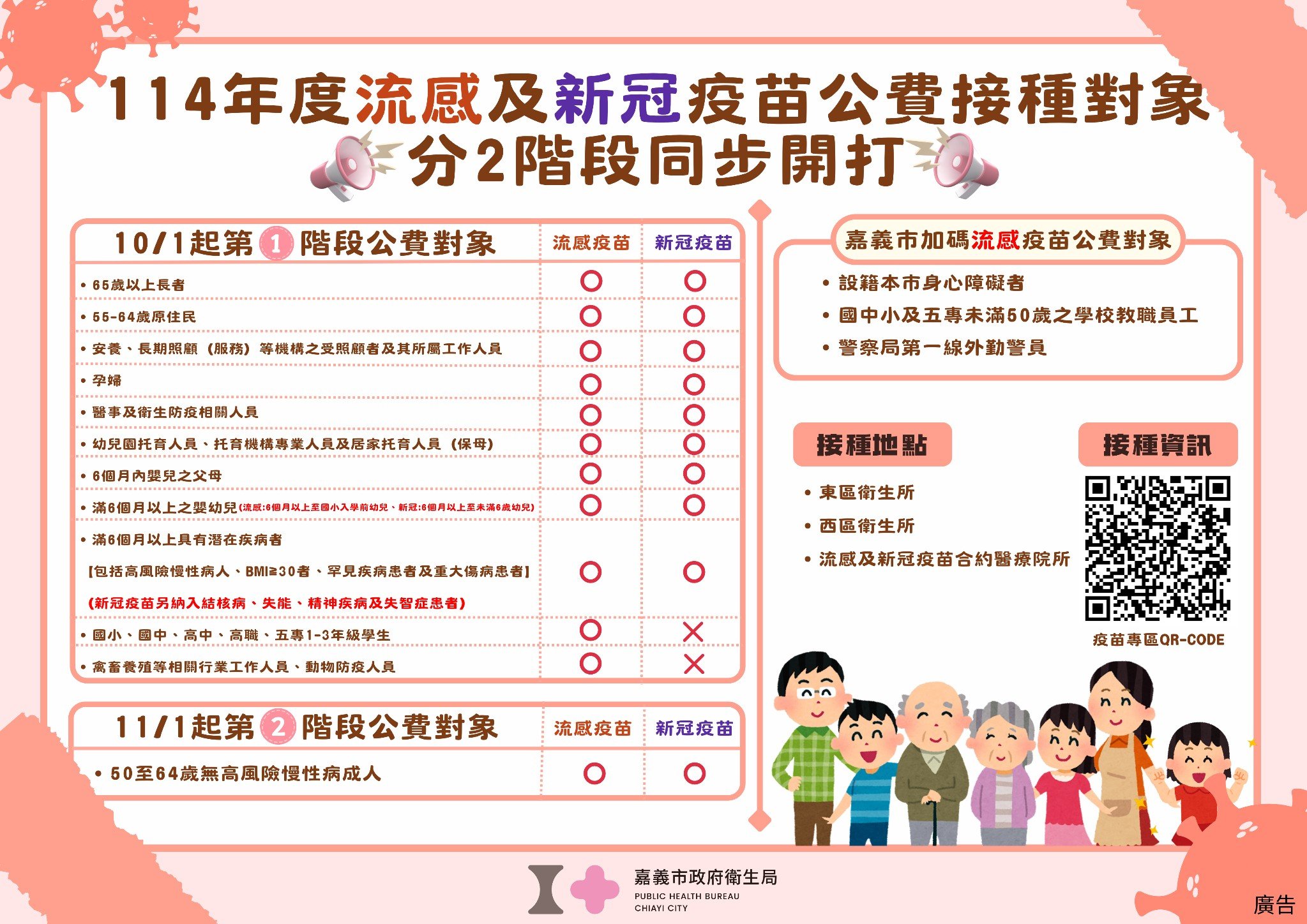 接種流感疫苗跟COVID-19疫苗可降低重症發生風險。 秋冬為呼吸道傳染病好發季節,接種疫苗為預防流感及新冠最好的方法, 可降低重症與死亡風險,請符合資格民眾踴躍接種。 嘉義市長黃敏惠關心您。 114年度公費流感及新冠疫苗開打時間&接種對象。(圖片提供/疾病管制署) 114年度公費流感及新冠疫苗開打時間&接種對象。(圖片提供/嘉市A健康的FB貼文) 114年度公費流感及新冠疫苗開打時間&接種對象。(圖片提供/嘉義市政府衛生局) 114年度公費流感及新冠疫苗開打時間&接種地點。(圖片提供/嘉市A健康的FB貼文)